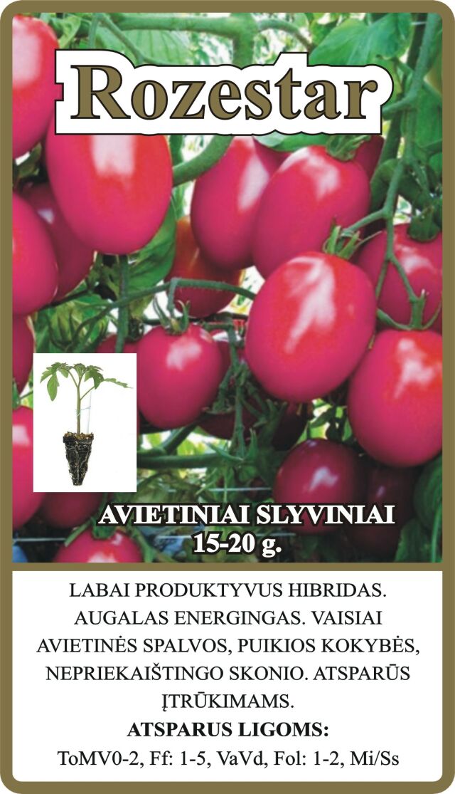 Aukštaūgis, tinka auginti šiltnamiuose, ankstyvas.  Rozestar F1 – mažas kriaušės formos pomidoras, kuris išsiskiria rožine spalva ir puikiu skoniu. Vaisiai saldūs, aromatingi, netrūkinėja.